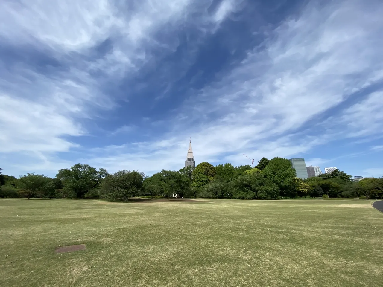 眼の前には広大な芝生、遠くにはNTTドコモタワーなどのビル群が広がり、その奥行きにリラックスできるでしょう。レジャーシートを持参し、二人で寝転がるのも良いアイデアです。