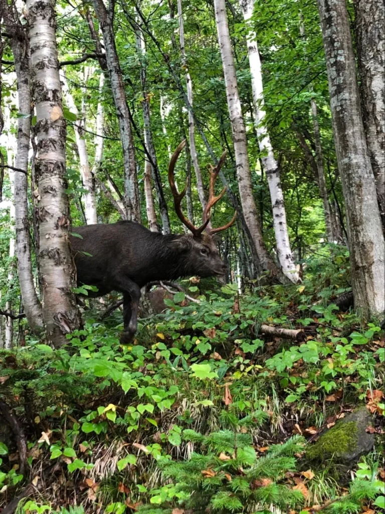 続いての画像は、カムイワッカ湯の滝に向かう途中で出会ったオスのエゾシカです。馴染みのある茶色の毛ではなく、黒の毛を身にまとったエゾシカで、立派なツノをこしらえた様子とその佇まいは、かっこよさとともに目を疑うほどのインパクトがあります。