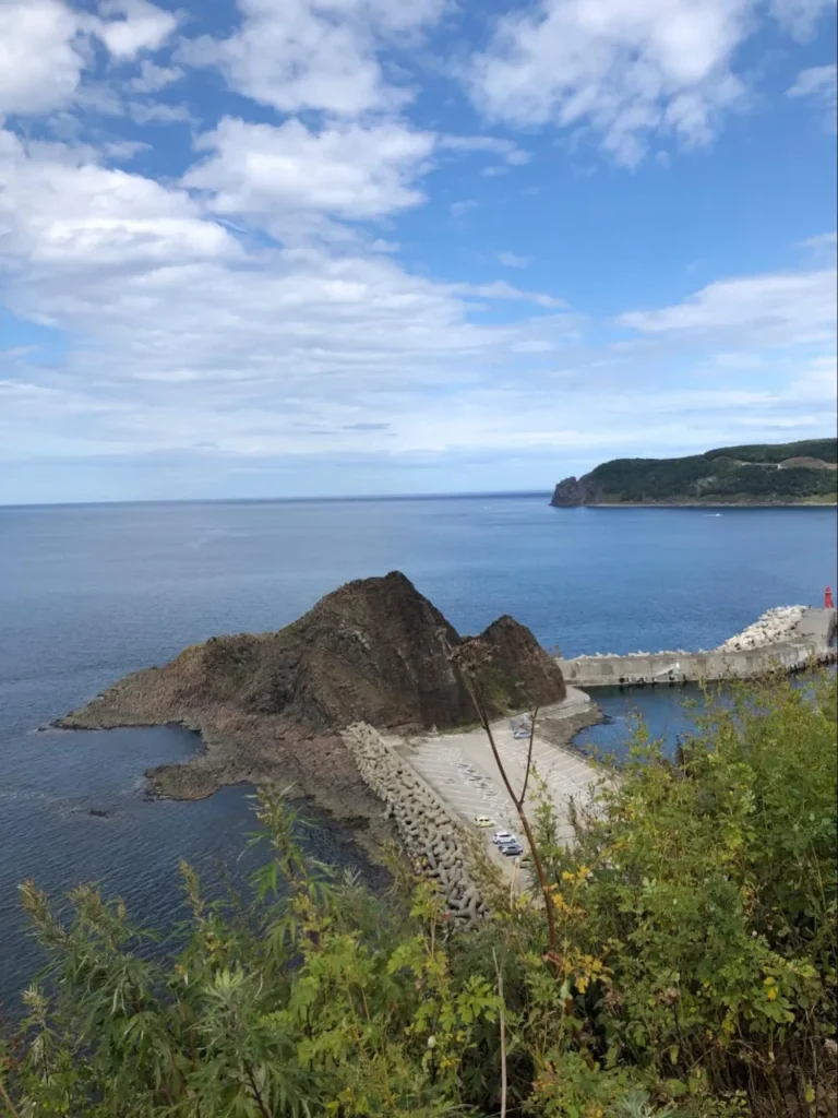続いての写真は、オロンコ岩からの景色です。岩といっても高さはなんと約60m。その頂上からは、青色に輝くオホーツク海やウトロ漁港、天気がよければ知床連山を望めます。階段は少々急ではありますが、二人で励まし合いながら登ってみてください。