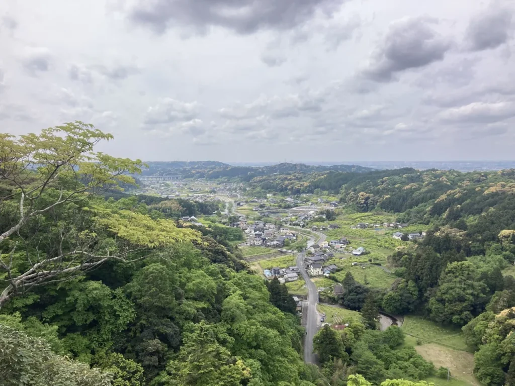 崖の上に設けられた展望台からは、真下に道路を走る車や民家が見え、高低差のある立体的な景観が楽しめます。