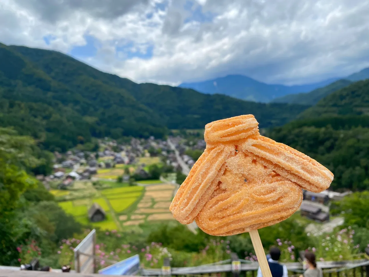 日によっては白川郷の「郷」の字や、合掌造りの形をしたチュロスも付近で販売されています。絶景を楽しみながらいただく熱々揚げたてのチュロスは絶品です。