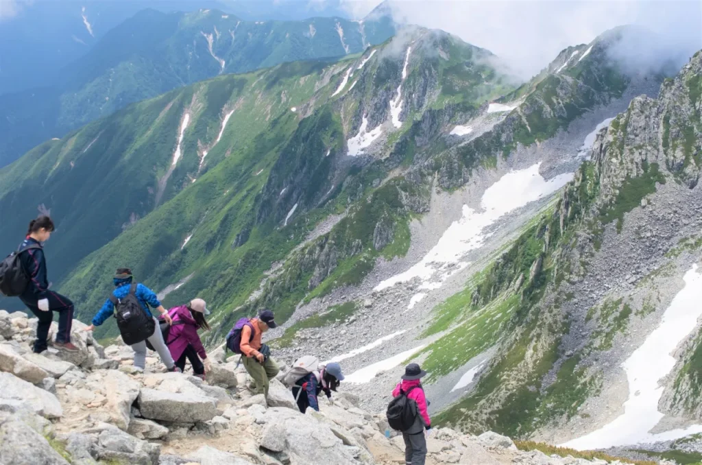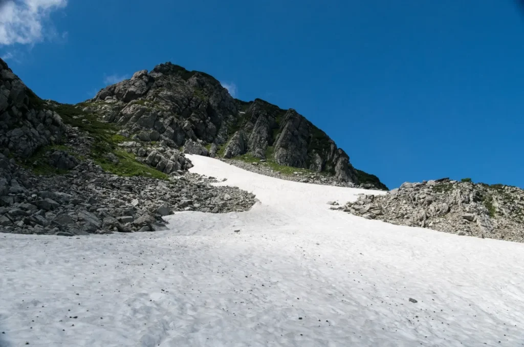 登山中に目にする美しい雪渓も立山登山の見どころのひとつ。日本有数の豪雪地帯である立山周辺は、夏でも大規模な雪渓が残る、国内でも数少ないスポットです。