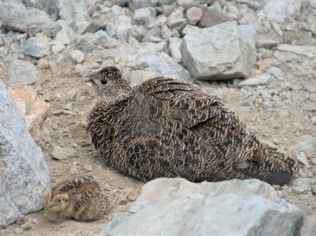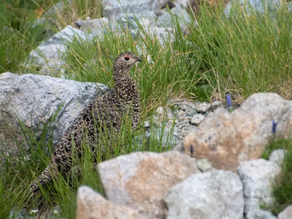 ライチョウは悪天候時に行動が活発になると言われています。特徴的なカエルのような鳴き声が聞こえたら、周囲を見渡してみましょう。