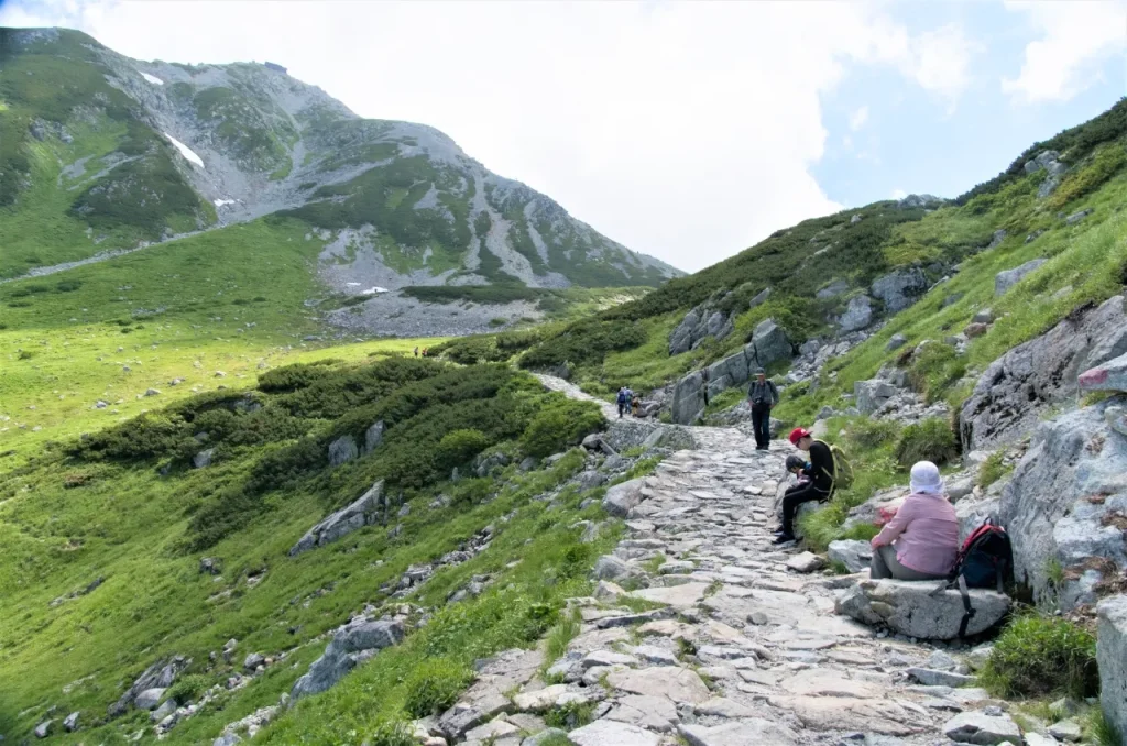 3,000m近い高所での急な登りは、思っている以上に消耗します。疲れてきたら足を休め、登ってきた道を振り返ってみましょう。室堂や、雄山の先に続く大汝山と富士ノ折立が一望できますよ。