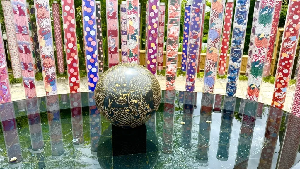 デザイナー森田 恭通氏が手がけた600本の友禅のポールは、まさに着物の森。夜はポールがそれぞれにやわらかく光るので、夜のデートにもおすすめです。