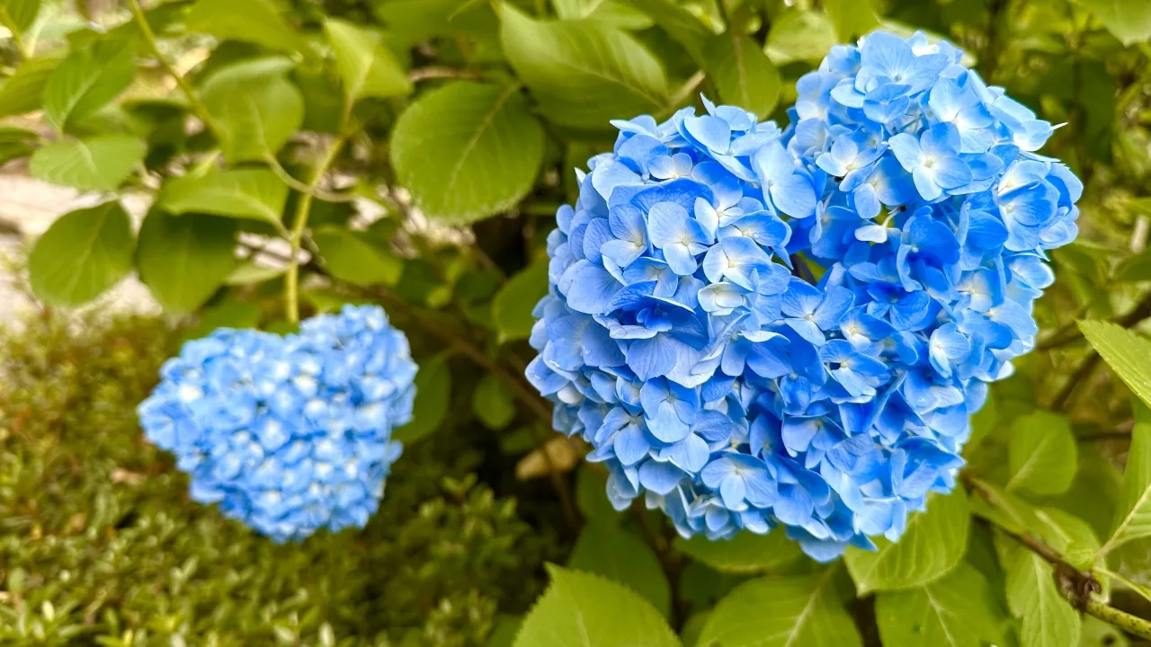 ヒメアジサイの鮮やかな青色の花びらを、麦雨(ばくう)の雫がそっと濡らしていました。写真に収めた一輪、ハートの形に見えませんか?
