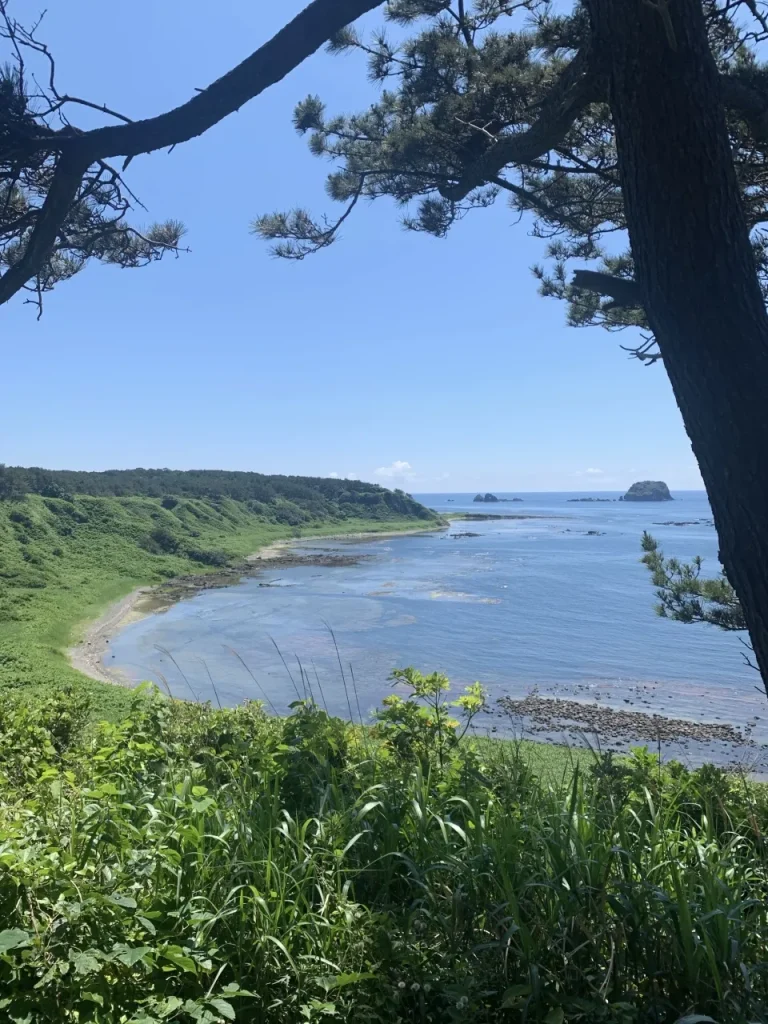 舘岩頂上からの景色を楽しんだら、道なりにふもとの海岸へ降りてみましょう。飛島で唯一の海水浴場があります。
