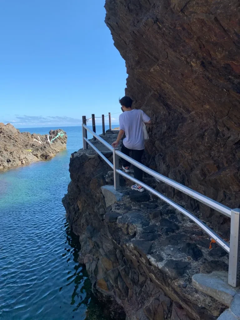 勝浦港から南へ海沿いの道を歩くと、すぐに大きな岩場が見えてきます。