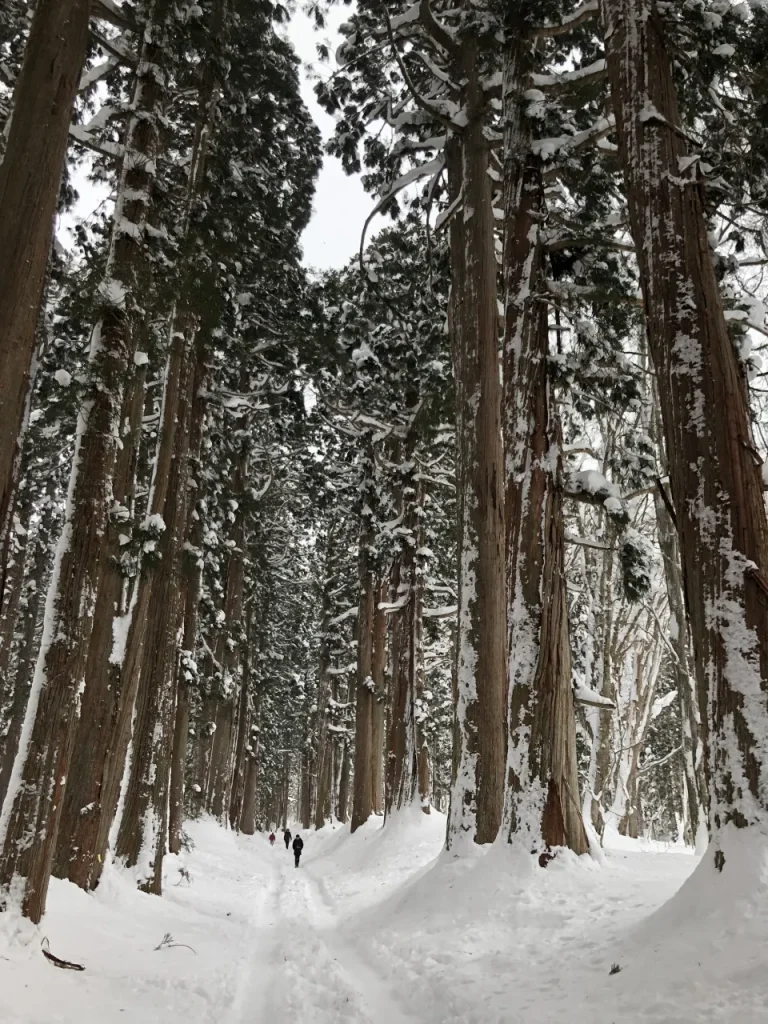 雪の降り積もる冬季に訪れる杉並木も幻想的。