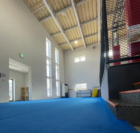 準備ができましたら、まずはトランポリン場の外側、青いチアマットの上でストレッチをしてください。ここでしっかり体をほぐしておきましょう。