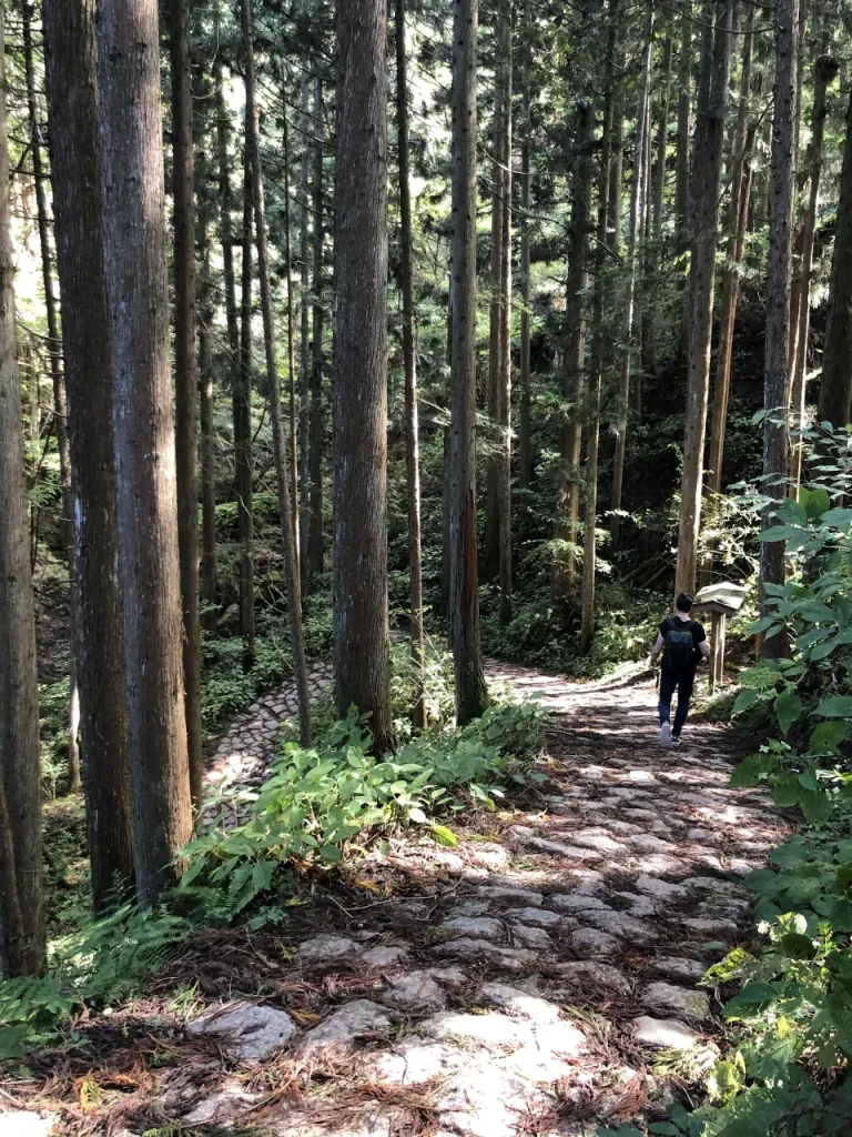 お茶屋を出たあとは、よく整備された石畳の道を下っていきます。杉並木や美しい渓流を眺めながら、二人でゆっくりと歩きましょう。