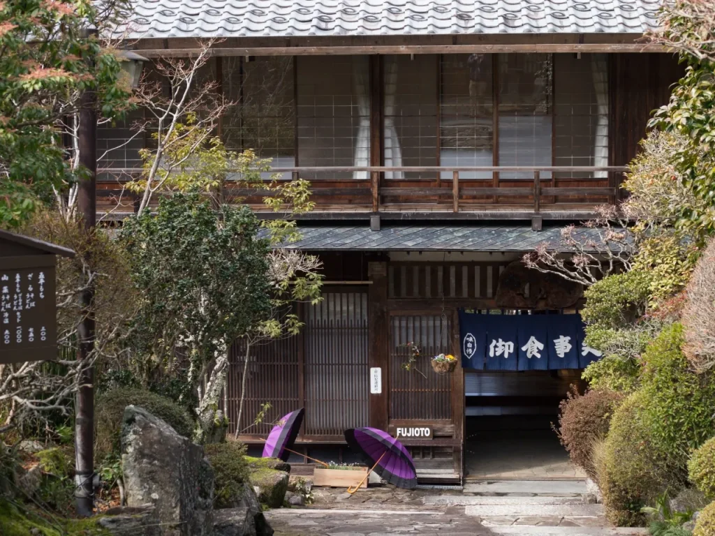 美しい日本庭園を眺めながら、妻籠名物のそばや牛肉のほうば味噌、川魚の甘露煮といったおいしい郷土料理を食べられますよ。
