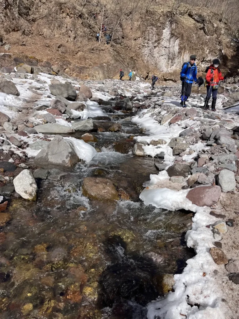 アイゼンや冬山用のウェア、ヘッドライト、GPSアプリなどの冬山の基本装備も必須です。また途中で何度も川を渡る必要があるため、完全防水の登山靴で臨みましょう。