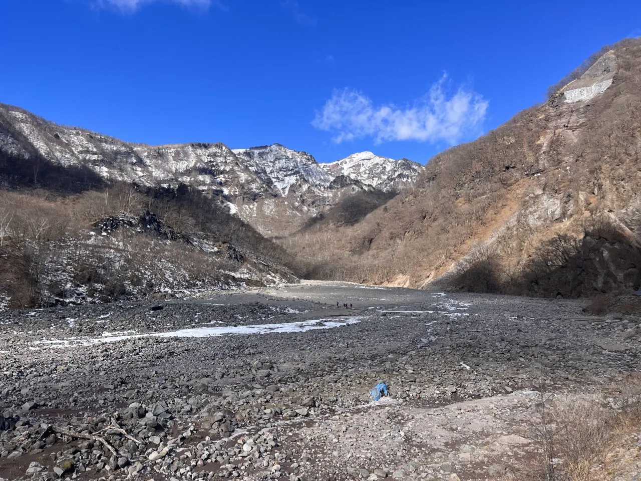通常のトレッキングルートはこの広場までですが、雲竜渓谷最大の氷爆である雲竜瀑はこのさらに奥。急斜面の崖を登る必要があります。
