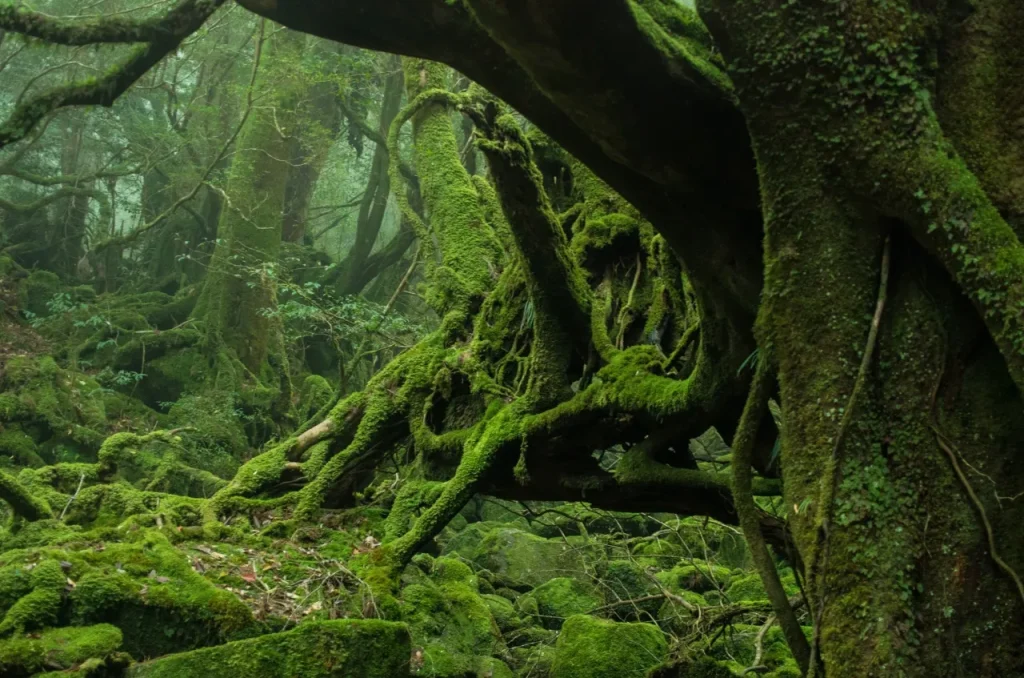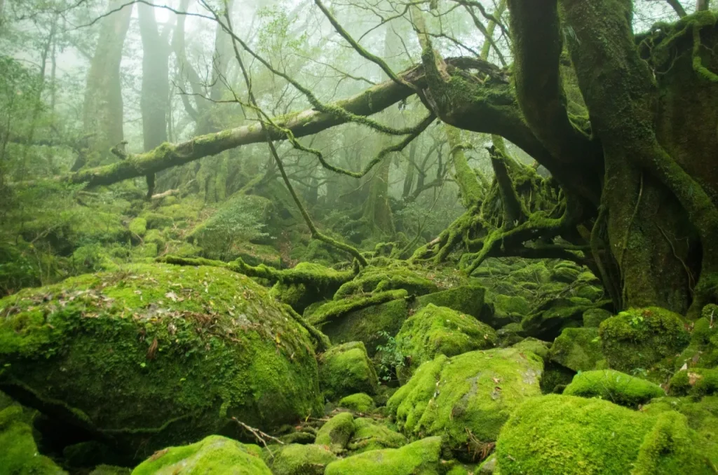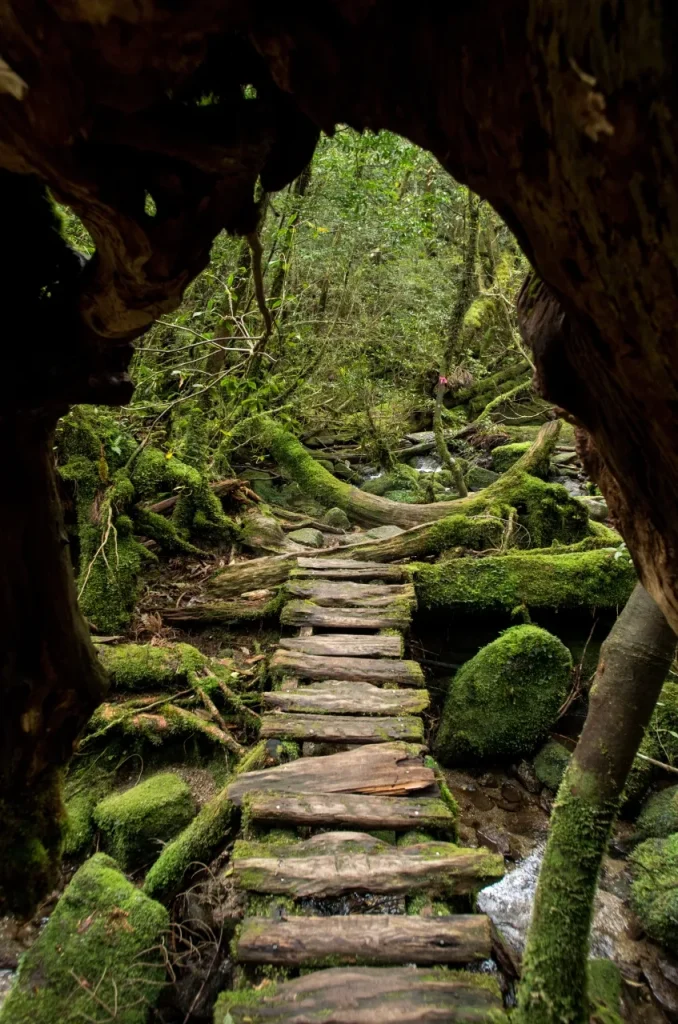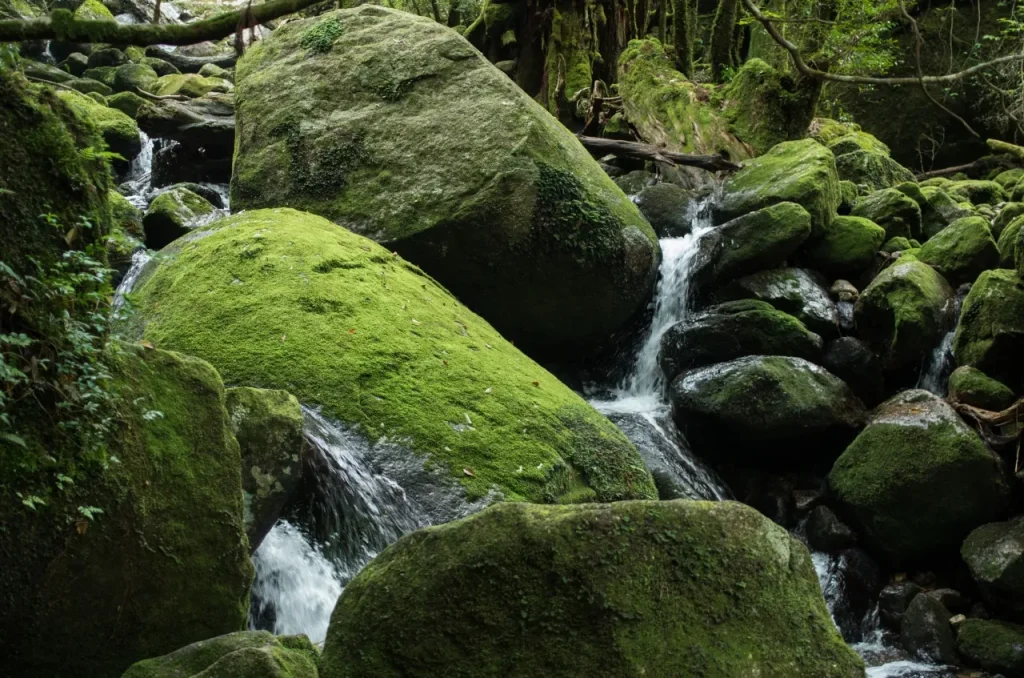 美しい小川を渡ったり、巨大な屋久杉の下をくぐったりしながら山道を1時間半ほど歩くと、最大の見どころ、苔むす森に到着します。
